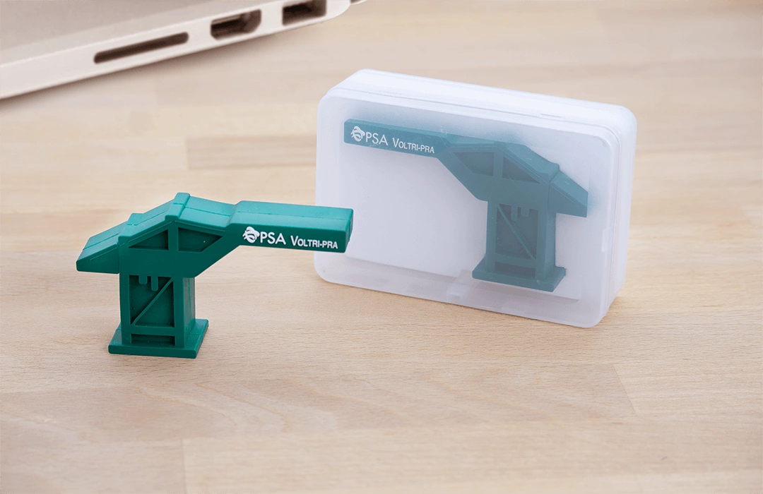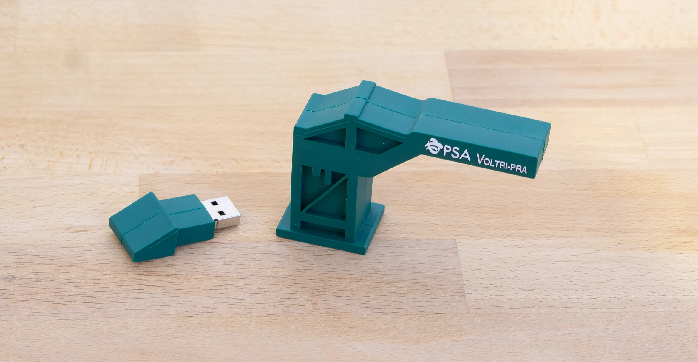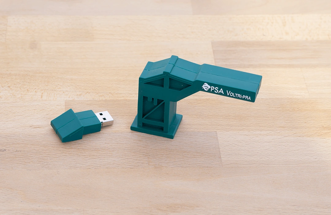 La chiavetta USB del PSA di Voltri è una replica in miniatura delle gru che popolano il Voltri Terminal Europa (VTE). Rappresenta e celebra il giorno esatto in cui queste imponenti strutture, con moderna tecnologia elettrica, sono arrivate da oltreoceano, dando vita a un momento davvero storico per il Porto.